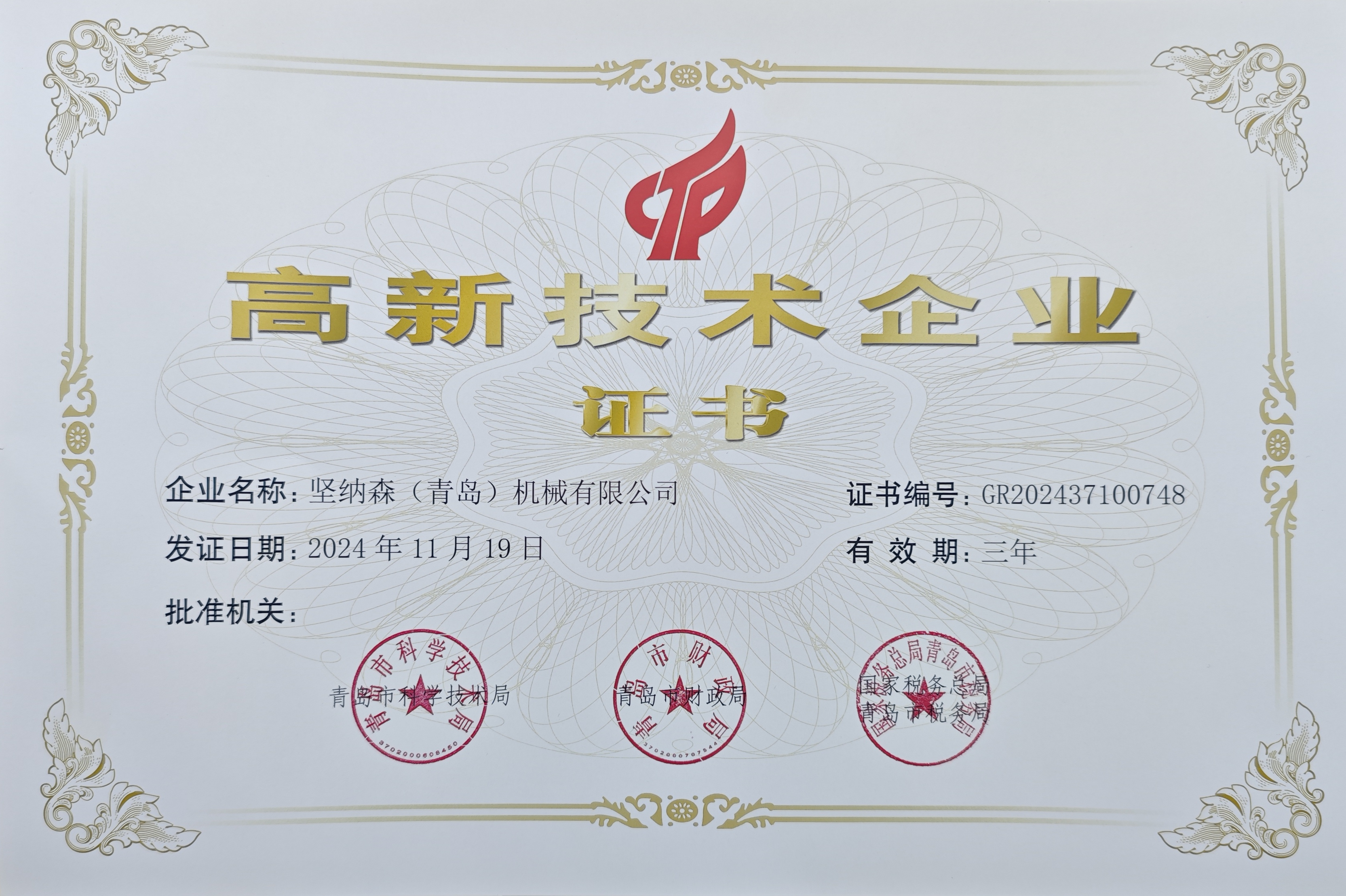 • 熱烈祝賀堅納森(青島)機械有限公司榮獲“高新技術(shù)企業(yè)”再次認定!